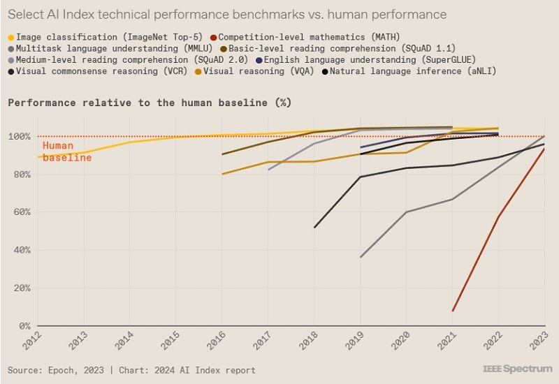 近年來,AI系統(tǒng)在一系列任務(wù)上的表現(xiàn)都超過了人類,包括閱讀理解和視覺推理,AI性能改進(jìn)的步伐也加快了?,F(xiàn)在人們?yōu)閿?shù)學(xué)競(jìng)賽引入了一個(gè)新的AI基準(zhǔn),人工智能從30%開始,然后在一年內(nèi)達(dá)到90%。雖然在復(fù)雜的認(rèn)知工作中,人類的表現(xiàn)仍然優(yōu)于AI,但讓我們明年再來看看情況如何。
