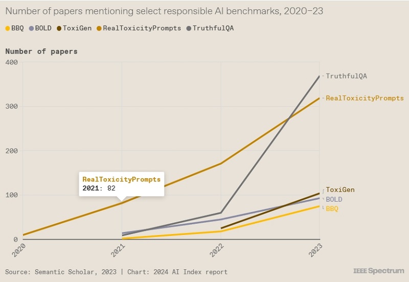 當(dāng)一家人工智能公司準(zhǔn)備發(fā)布一個(gè)大模型時(shí),其標(biāo)準(zhǔn)做法是根據(jù)該領(lǐng)域的流行基準(zhǔn)測(cè)試它,從而讓人工智能社區(qū)了解模型在技術(shù)性能方面的相互競(jìng)爭(zhēng)情況。然而,根據(jù)負(fù)責(zé)任的AI基準(zhǔn)測(cè)試模型并不常見,這些基準(zhǔn)評(píng)估有毒語(yǔ)言輸出(RealToxicityPrompts 和 ToxiGen)、響應(yīng)中的有害偏見(BOLD和BBQ)以及模型的真實(shí)程度(TruthfulQA)。這種情況開始改變,因?yàn)槿藗冊(cè)絹碓揭庾R(shí)到,根據(jù)這些基準(zhǔn)檢查一個(gè)人的模型是負(fù)責(zé)任的事情。然而,報(bào)告中的另一張圖表顯示缺乏一致性:開發(fā)人員正在根據(jù)不同的基準(zhǔn)測(cè)試他們的模型,這使得比較變得更加困難。