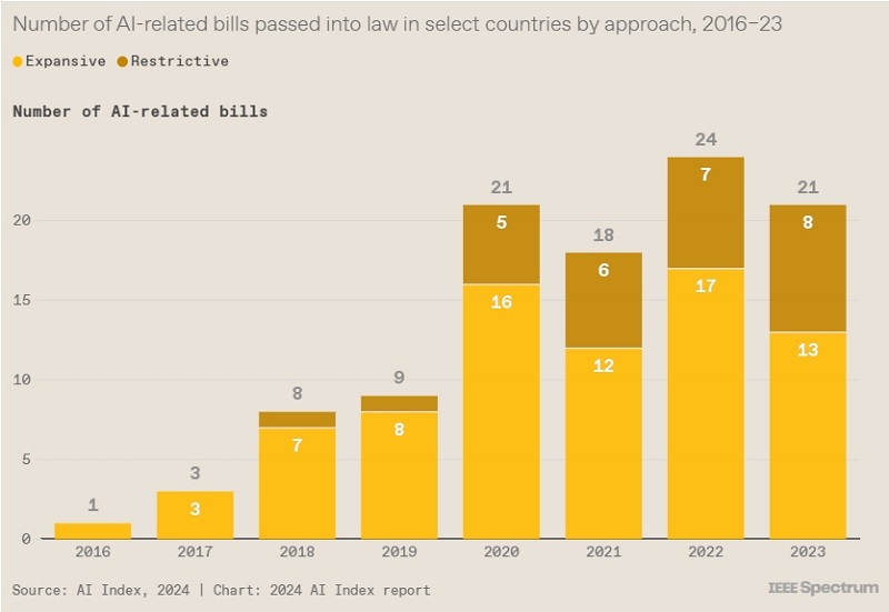 2016年至2023年期間,人工智能指數(shù)發(fā)現(xiàn),33個(gè)國(guó)家至少通過了一項(xiàng)與人工智能相關(guān)的法律,其中大部分行動(dòng)發(fā)生在美國(guó)和歐洲。在此期間,總共通過了148項(xiàng)與人工智能相關(guān)的法案。該指數(shù)的研究人員還將法案歸類為旨在增強(qiáng)一個(gè)國(guó)家人工智能能力的擴(kuò)張性法律或限制人工智能應(yīng)用和使用的限制性法律。雖然許多法案在繼續(xù)推動(dòng)人工智能的發(fā)展,但研究人員發(fā)現(xiàn),從全球趨勢(shì)來看,對(duì)人工智能的限制性立法正在增多。