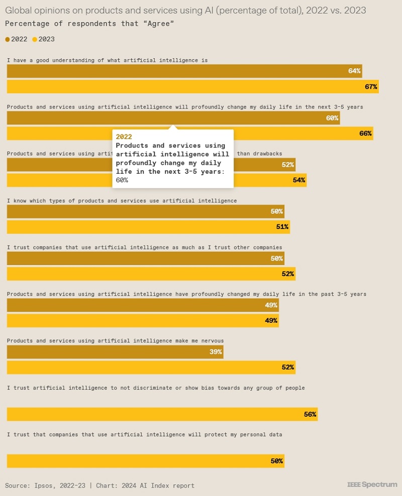報(bào)告中有一項(xiàng)關(guān)于對(duì)人工智能態(tài)度的全球調(diào)查,來自31個(gè)國(guó)家的22,816名成年人(16至74歲)參與了調(diào)查。超過一半的受訪者表示,人工智能讓他們感到緊張,高于前一年的39%。現(xiàn)在有三分之二的人預(yù)計(jì)人工智能將在未來幾年內(nèi)深刻改變他們的日常生活。有趣的是,許多對(duì)于人工智能的悲觀情緒來自西方發(fā)達(dá)國(guó)家。