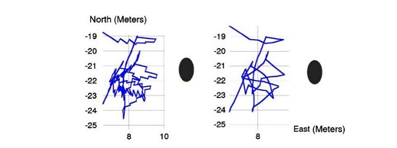 這幅圖片記錄了機(jī)遇號(hào)在Wopmay巖石附近的行駛軌道。黑色的橢圓大致代表巖石的位置。左側(cè)的圖片為IMU+車輪里程記記錄的位置,右側(cè)的圖片為相同路線經(jīng)過VO修正后接近真實(shí)行駛路徑的數(shù)據(jù)。