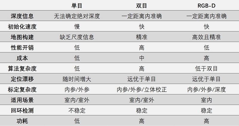 我們?cè)谝粡埡?jiǎn)單的表格中列舉了目前三種主流的SLAM方案——單目、雙目、RGB-D。從下列表格中,可以快速了解三種方案各自的優(yōu)缺點(diǎn)。