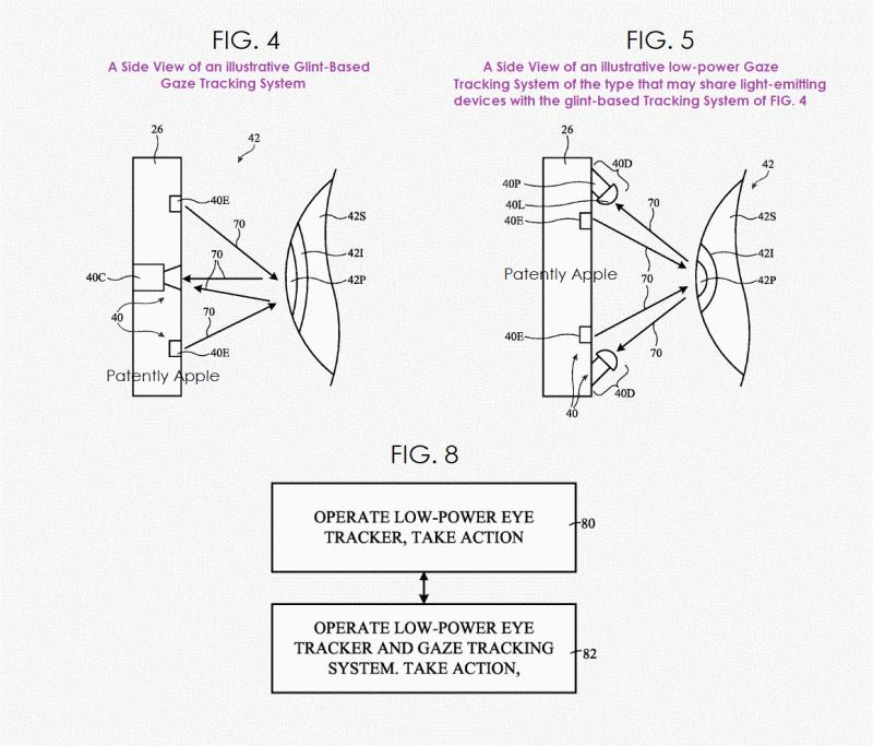 蘋果專利圖4為說明性基于閃爍的注視追蹤系統(tǒng)的側(cè)視圖;圖5為基于閃爍的注視追蹤系統(tǒng)共享發(fā)光設(shè)備的說明性低功率注視追蹤系統(tǒng)側(cè)視圖。