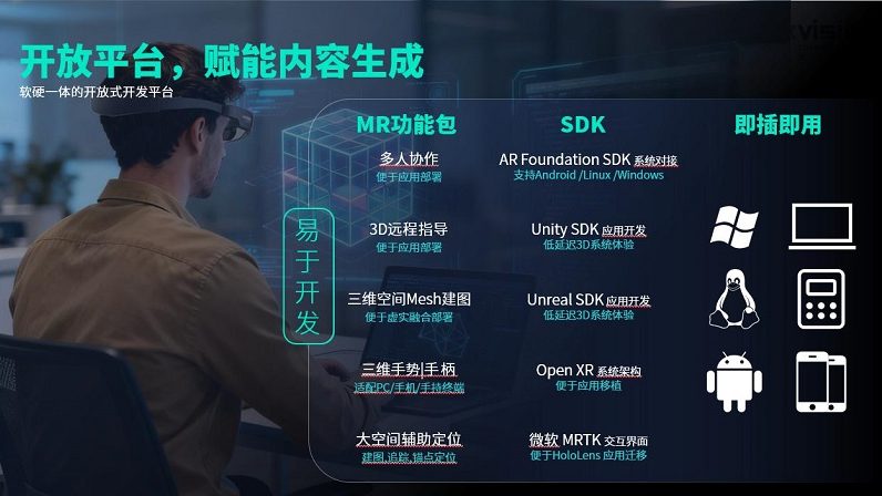 此外,詮視科技為開發(fā)者提供了軟硬一體的開放式平臺,全面支持AR Foundation、UNITY、UNREAL、Open XR等主流3D引擎與MRTK交互框架,并可靈活部署于Windows、Linux、Android等多種操作系統(tǒng),助力各類場景的快速落地。