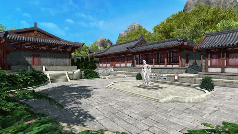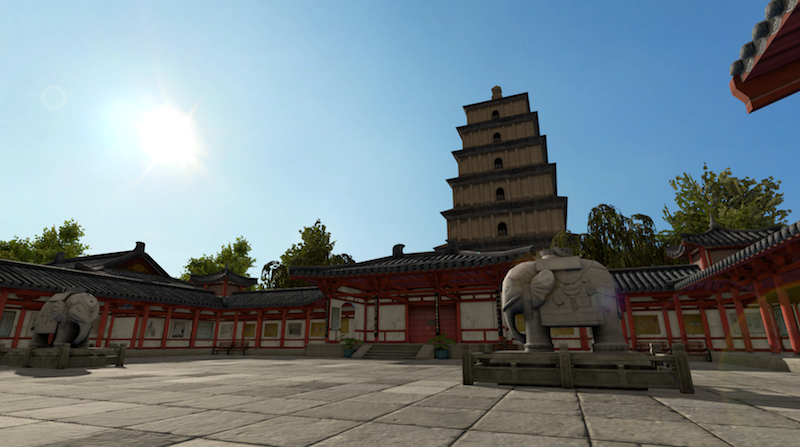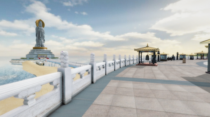 其次,在一個(gè)虛擬景區(qū)里游覽,眩暈癥也是一個(gè)問題。“目前大部分PCVR的游戲或應(yīng)用都采取了瞬移的方式,我們現(xiàn)在也是用瞬移的方式,但我們想把瞬移做得更自然一些,不要一下子就過去,讓用戶感覺不知所措。所以我們采取了定點(diǎn)跳轉(zhuǎn),用戶可以看到前面有哪些點(diǎn)可以進(jìn)行跳轉(zhuǎn),這樣就不至于跳到很奇怪的地方。同時(shí)在用戶身邊,我們會(huì)安排一個(gè)小姑娘陪著你邊走邊看,同時(shí)給你做一些講解。”