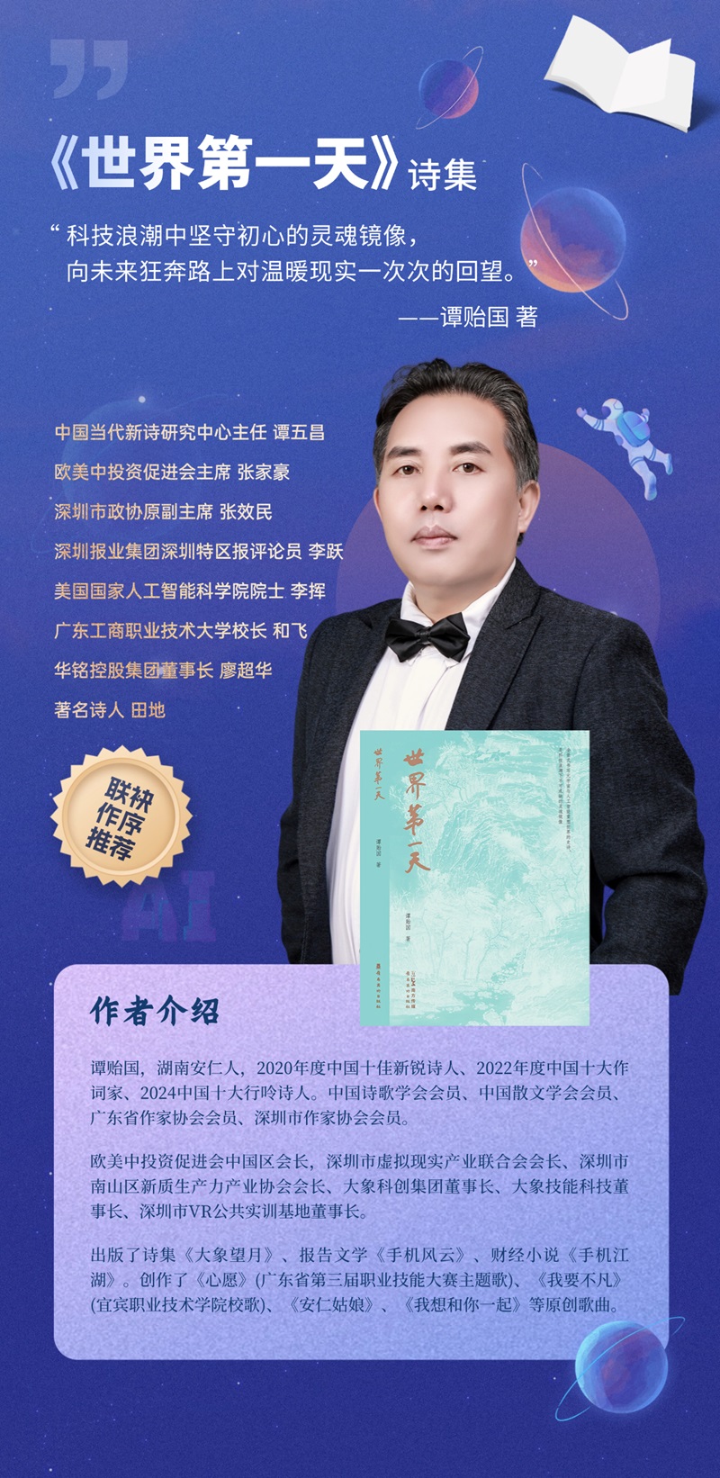 湖南安仁人譚貽國,這位集大象科創(chuàng)數(shù)字經(jīng)濟(jì)產(chǎn)業(yè)(深圳)集團(tuán)有限公司、深圳市虛擬現(xiàn)實(shí)產(chǎn)業(yè)聯(lián)合會(huì)會(huì)長、跨界詩人、作家等多重身份于一身的行業(yè)精英,始終在科技與人文的領(lǐng)域不斷探索。作為中國新產(chǎn)業(yè)資深分析專家、中國十大策劃人之一,他此次推出的《世界第一天》,無疑將在行業(yè)內(nèi)外產(chǎn)生深遠(yuǎn)影響,為人們探索未來世界提供新的視角和思路。