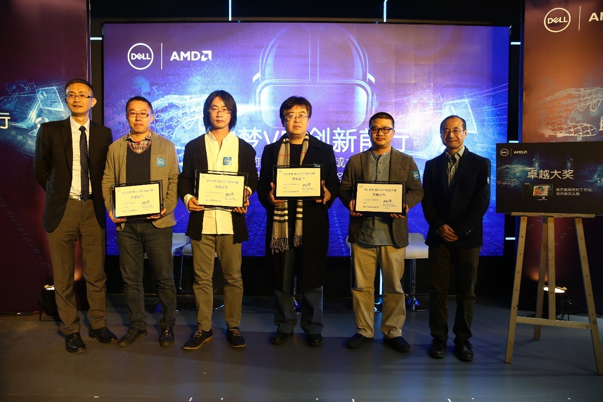 戴爾大中華區(qū)副總裁終端客戶解決方案事業(yè)部林浩與AMD大中華區(qū)市場營銷副總裁紀(jì)朝暉頒發(fā)“創(chuàng)見未來”戴爾VR開發(fā)者大賽卓越大獎