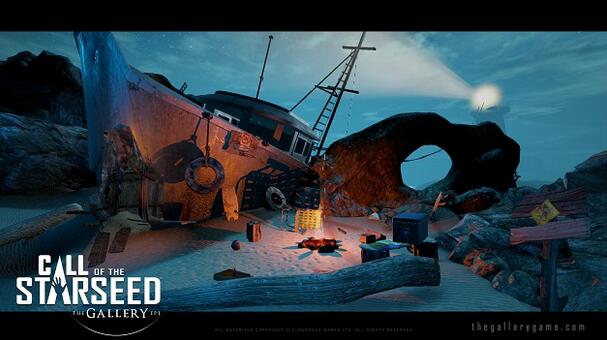在奠定了基礎以后,《畫廊:第一章-星種召喚》就會使你沉浸在游戲世界中。黑暗陰郁的海灘對于VR狂熱者來說是兩年前就體驗過的精彩,但對新手來說無疑是不可思議的景象。使玩家拿起物體和在視覺上分析物體是Cloudhead Games不吝投入開發(fā)的能力。金屬罐、瓶子、煙火、椅子、爆米花和貝殼等等,使環(huán)境凌亂不堪,也沒有實際目的,但它們的出現(xiàn)使玩家可以悠閑地在其中感嘆VR世界的奇妙。這一設計是針對新玩家的,但是游戲的視覺保真度也會使富有經(jīng)驗的VR用戶愿意進行互動,不過如果場景更簡潔些就好了。