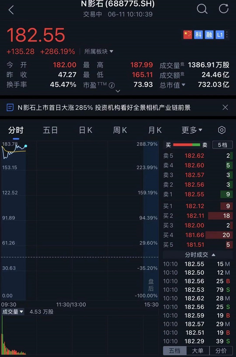 深圳企業(yè)影石創(chuàng)新(Insta360影石)成功在資本市場激起千層浪。11日,影石創(chuàng)新正式登陸上海證券交易所科創(chuàng)板,開啟了企業(yè)發(fā)展的新篇章。此次發(fā)行,影石創(chuàng)新每股發(fā)行價(jià)格定為47.27元,發(fā)行后總股本達(dá)40100萬股,發(fā)行市盈率為20.04倍。上市首日,其表現(xiàn)堪稱驚艷,開盤價(jià)直接飆升至182元/股,較發(fā)行價(jià)上漲285%。截至11日10點(diǎn)10分,股價(jià)更是一路高歌猛進(jìn),最高漲幅達(dá)298%,觸及188元/股,最新市值也隨之攀升至732億元,瞬間成為市場焦點(diǎn)。