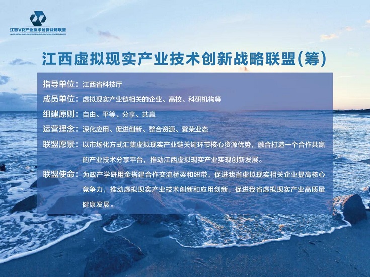 江西省虛擬現(xiàn)實(shí)產(chǎn)業(yè)技術(shù)創(chuàng)新戰(zhàn)略聯(lián)盟(籌)是在江西省科技廳指導(dǎo)下,由積極推進(jìn)江西虛擬現(xiàn)實(shí)產(chǎn)業(yè)發(fā)展、從事VR相關(guān)技術(shù)研發(fā)、產(chǎn)品生產(chǎn)、內(nèi)容創(chuàng)作、金融服務(wù)提供以及運(yùn)營管理等產(chǎn)業(yè)技術(shù)創(chuàng)新鏈的三大運(yùn)營商、高校、科研機(jī)構(gòu)、企業(yè)等多個(gè)獨(dú)立法人按照“自愿、平等、分享、共贏”的原則組建的地方性、非盈利性社會(huì)團(tuán)體。