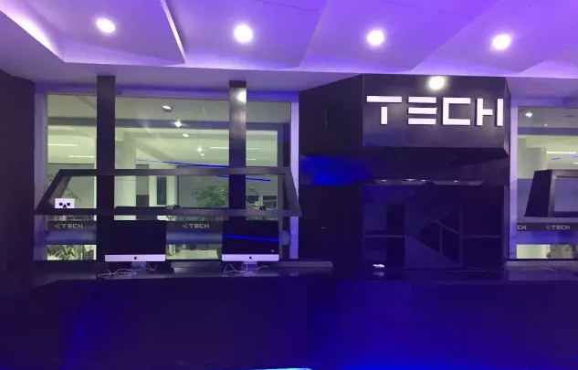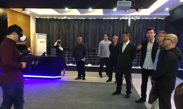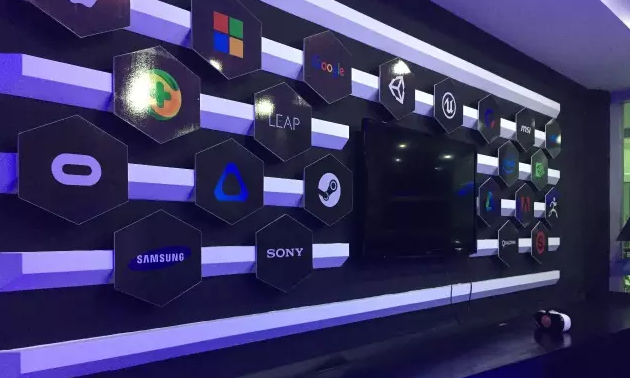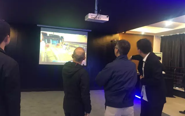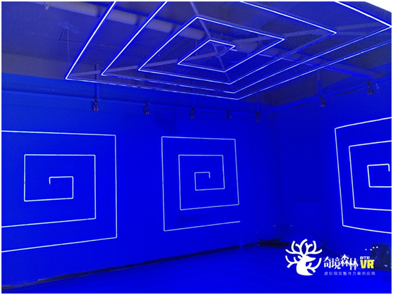 深藍色加上熒光螺旋描邊,顯得場地科技感十足。在這里你只需要戴上VR頭顯,手端體感槍,就能置身于龐大的而真實的游戲世界用全身動作與虛擬場景進行互交;你可以選擇和對手進行一對一的白刃戰(zhàn),或者選擇和隊友一起戰(zhàn)斗,自定義游戲方案,實現(xiàn)即時互動。