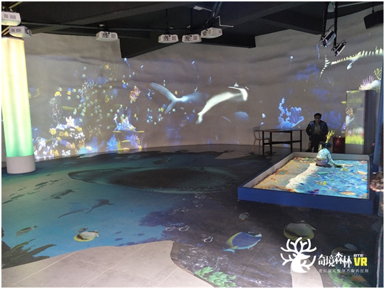 虛擬沙灘是二期新增項目運用紅外感應(yīng)、虛擬現(xiàn)實、互動投影等多種交互技術(shù),將海濱風(fēng)光遷移到了室內(nèi)空間,碧波蕩漾的海灘,孩子夢可以下海捕魚,將捕捉到的魚兒存放在岸邊小水池內(nèi)。