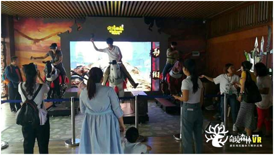根據(jù)貴州歷史制作的VR馬戰(zhàn)游戲,在最新的振動儀動感器上身騎駿馬,感受馳騁快感,手執(zhí)利刃穿越峽谷棧道,跟著傅友德將軍帶領(lǐng)三十萬大殺四方,殲滅叛賊感受冷兵器時代戰(zhàn)爭的熱血!除了動感器外,還配有VIVE頭顯游戲手柄、4K OLED超清大屏和3D立體音效環(huán)繞系統(tǒng),不過這次的是兒童特制版,奇境森林員工告訴我成人版響應(yīng)太好,但是對于小朋友來說過于危險,歡樂節(jié)期間很多小朋友有英雄夢都未實現(xiàn),所以在二期布置了兒童版的大明西征。