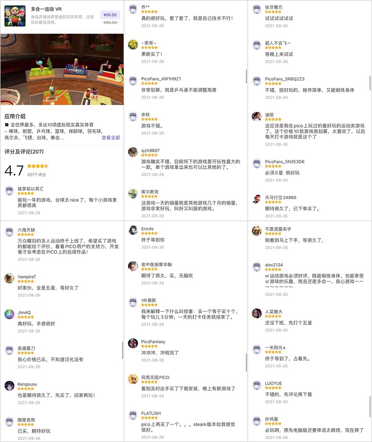 根據(jù)Pico官方日前公布的消息,「多合一運(yùn)動(dòng) VR」自8月26日登陸Pico Store以來,打破了Pico平臺新游上線首周下載量和銷售額雙記錄。截至目前,「多合一運(yùn)動(dòng) VR」在Pico Store已收獲220+條評論,綜合評分高達(dá)4.6分(滿分5分)。