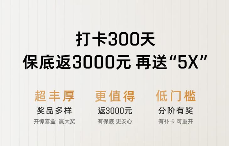 為激發(fā)用戶的使用熱情,官方還發(fā)起了“打卡300天,保底返3000元,再送5X”的活動——購買奇遇Dream Pro產(chǎn)品的用戶,都可以參加官方發(fā)起的運動打卡互動,有30天、100天、300天三個梯度,完成相應(yīng)的任務(wù)積累獎勵,最高完成300天連續(xù)打卡,可以獲得保底3000元的返現(xiàn),以及有機會贏取拯救者筆記本電腦大獎。而且還可以重新開始打卡和抽免打卡券。門檻更低、誠意更足、獎勵更豐厚!
