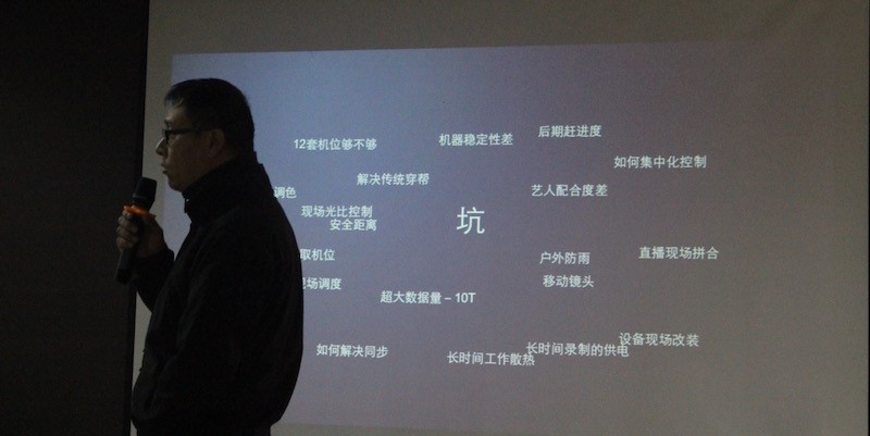 從拍攝角度來講,我們并不認(rèn)為VR適合傳統(tǒng)意義的電視模式。目前所有綜藝節(jié)目的表演和舞臺(tái)布置都是基于電視節(jié)目多年經(jīng)驗(yàn)形成的套路。如果我們用傳統(tǒng)方式拍攝VR視頻會(huì)失去很多的趣味性,我們希望通過拍攝VR綜藝節(jié)目來探索出一條適合VR的道路。在制作VR綜藝節(jié)目時(shí)我們遇到了很多坑,比如如何解決傳統(tǒng)的穿幫問題,如何解決現(xiàn)場(chǎng)的縫合問題,如何跟節(jié)目組爭(zhēng)取機(jī)位,包括現(xiàn)場(chǎng)設(shè)備的散熱,包括現(xiàn)場(chǎng)拍攝的超大數(shù)據(jù)吞吐量,我們?cè)谂臄z《中國新歌聲》時(shí)一天需要的數(shù)據(jù)吞吐量是10TB。這些都是很大的問題。
