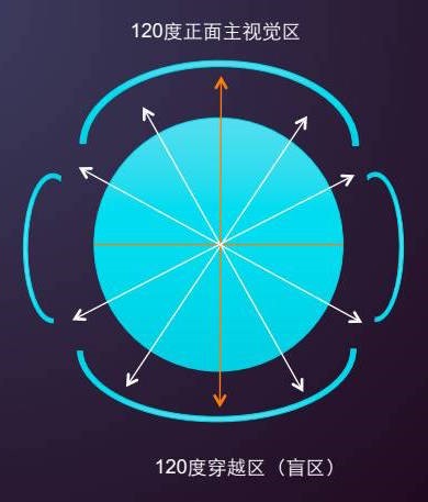 這里特別說明一下VR拍攝的空間劃分。我們發(fā)現(xiàn)大部分VR視頻遇到最大的一個(gè)問題就是你必須要站著看,因?yàn)槟悴恢佬畔⒃词菑淖筮€是從右出現(xiàn),這樣導(dǎo)致了你在空間里迷失。由此我們定義了VR拍攝的空間劃分,對(duì)于任何設(shè)備我們都會(huì)標(biāo)定一個(gè)正方向位,正方向所在的120度為正視區(qū)。我們?nèi)搜鄣挠^察角度一般在120度,有效的VR眼鏡一般是在90-100度,把頭往兩邊轉(zhuǎn)動(dòng)最大程度是正軸方向往后30度,也就是說120度的正視區(qū)加兩邊各60度等于人正常轉(zhuǎn)動(dòng)頭部的視區(qū),后面的120度盲區(qū)是必須需要人站立并且轉(zhuǎn)動(dòng)身體才能觀看的。