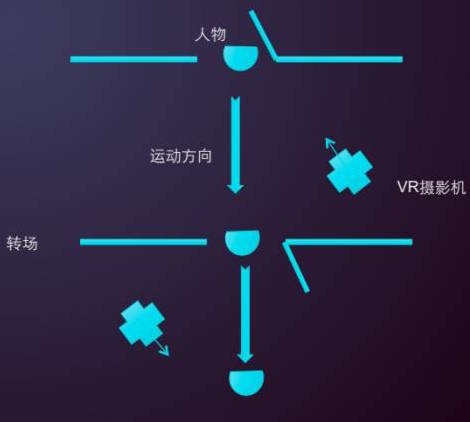 當(dāng)我們劃分完區(qū)域之后,我們就可以定義調(diào)度了,我們定義所有的表演都是在正面90度和120度的空間區(qū)域里,由此我們就有了一個(gè)機(jī)位示意圖。整個(gè)空間區(qū)域就像是12個(gè)時(shí)區(qū),在拍攝時(shí)候的,演員從VR攝像機(jī)正方向的12點(diǎn)走到9點(diǎn)或6點(diǎn)位置(相當(dāng)于從觀眾面前右側(cè)走到左側(cè)),下一個(gè)轉(zhuǎn)場(chǎng)則是從9點(diǎn)走回12點(diǎn)位置(相當(dāng)于從觀眾面前左側(cè)走回右側(cè)),這樣鏡頭與鏡頭的轉(zhuǎn)場(chǎng)不必要讓觀眾始終圍繞機(jī)位去轉(zhuǎn)圈,而且大部分時(shí)間可以留在觀眾前方180度的區(qū)域,而后面的盲區(qū)只是偶爾留給觀眾的一些驚喜。有了這樣的方式之后,我們?cè)诩糨嬤^程中就有了一個(gè)規(guī)則,我們就通過這種規(guī)則來方便的制作VR影片,而不再是盲目的選擇機(jī)位,或者臨時(shí)性的隨意拍攝了。觀眾在觀看時(shí)也會(huì)有一個(gè)默認(rèn)方向,很適合躺在床上或坐在沙發(fā)上看一個(gè)有趣的VR節(jié)目或影片。