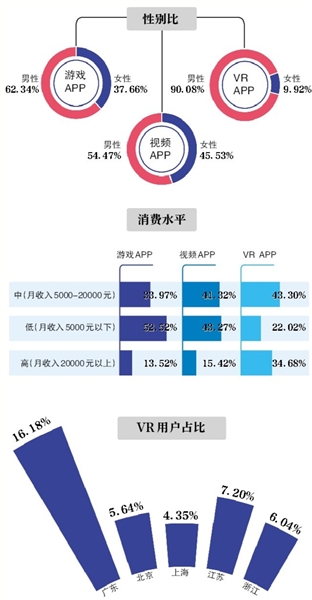 而VR的普及程度也與地域硬件發(fā)展有直接的關(guān)系:廣東省的電子科技和智能硬件較發(fā)達(dá),VR的用戶中有16%都來自廣東;而北京只占5%,上海則占4%。