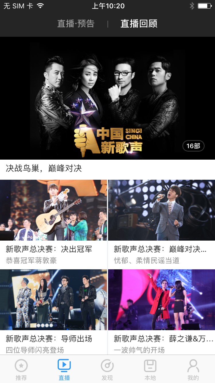 在“直播回顧”窗口,你會(huì)看到之前直播過的內(nèi)容。這里也根據(jù)主題對直播回顧內(nèi)容進(jìn)行了分類,比如說中國新歌聲總決賽的所有曲目都包含在“中國新歌聲”的大圖標(biāo)之下,而且大圖標(biāo)上還顯示了本類內(nèi)容的數(shù)量。