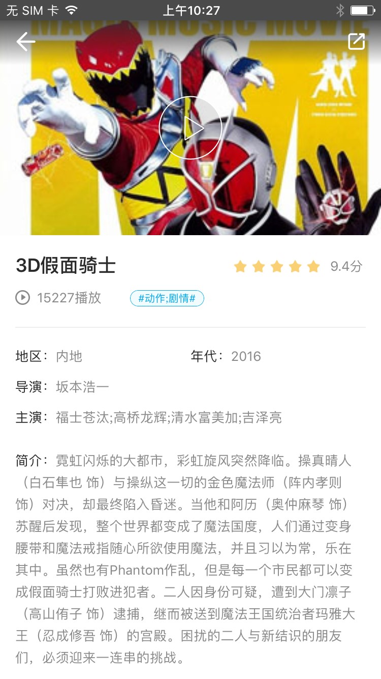 那么微鯨VR APP觀看3D電影到底是什么樣呢?我選了這部《3D假面騎士》,不要問我為什么要看這部,如果有《天線寶寶》,我就會(huì)看《天線寶寶》。和之前一樣,首先進(jìn)入的窗口會(huì)顯示該電影的詳細(xì)信息,再次點(diǎn)擊播放按鈕,即可進(jìn)入假面騎士的世界。