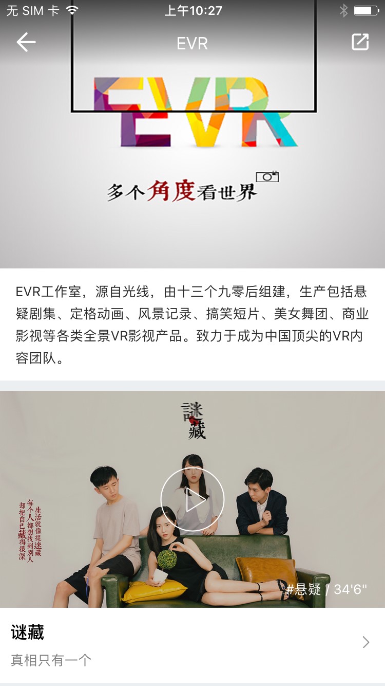 來自光線的EVR工作室是我個(gè)人非常喜歡的一個(gè)CP團(tuán)隊(duì),據(jù)說他們拍攝每一部作品都要求成本不超過500元,在如此情況下,我還是看到了很多有意思的內(nèi)容。點(diǎn)擊EVR的圖標(biāo),進(jìn)入EVR的內(nèi)容窗口,你會(huì)看到他們的全部作品,至于作品是不是好看,先看了再說!