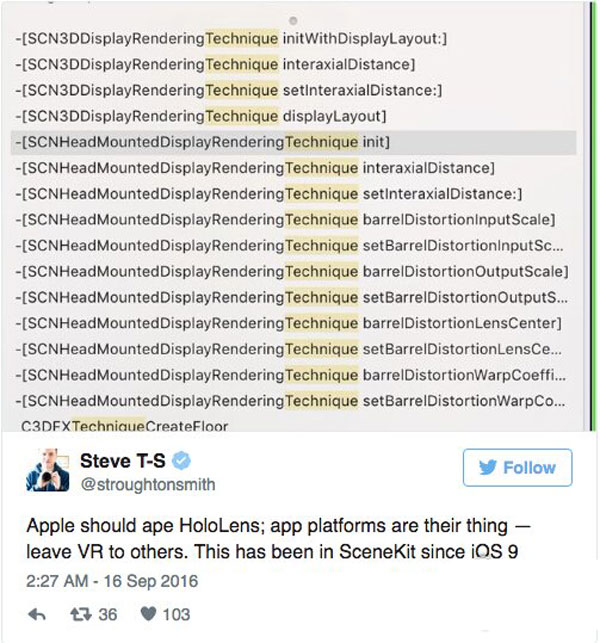 近日,著名的 iOS 開發(fā)者 Steven Troughton-Smith 發(fā)出的推文,為我們猜測(cè)蘋果的 VR/AR 布局帶來(lái)了新的情報(bào)。Steven 透露, 蘋果在其關(guān)鍵開發(fā)框架中添加了數(shù)個(gè)可供開發(fā)者調(diào)用開發(fā) VR/AR 功能的“ 頭戴式顯示器渲染技術(shù)” 引用文件,這些文件可以被開發(fā)者調(diào)用來(lái)開發(fā)一些 VR/AR 相關(guān)功能 。