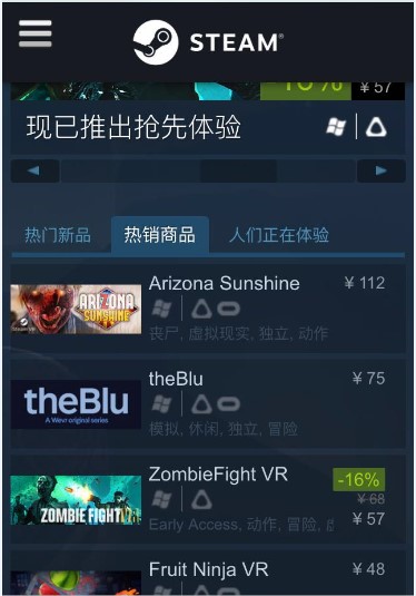 太平洋時(shí)間2017年1月20日17點(diǎn),《ZombieFight VR》正式登陸Steam平臺(tái)。這款似乎是老題材老套路的喪尸射擊游戲,一上線后卻得到眾多國(guó)內(nèi)外玩家的熱捧。春節(jié)期間,該游戲一直登頂虛擬現(xiàn)實(shí)商品熱銷榜,甩掉同期上線的其他游戲好幾條街。國(guó)外著名游戲 《Arizona Sunshine》的玩家都來體驗(yàn)該游戲并且給予支持,在熱銷商品榜上《ZombieFight VR》一度緊隨其后。