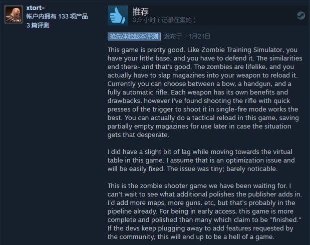 現(xiàn)在來感受一下一些玩家中肯的好評(píng),有玩家表示,《ZombieFight VR》是他們等待已久的喪尸射擊題材游戲,希望盡快更新更多新內(nèi)容,而且連優(yōu)缺點(diǎn)都一一列舉了??蓯鄣耐鈬?guó)玩家上傳了第一次體驗(yàn)的視頻,著實(shí)看著就能體會(huì)到這款游戲的魅力。