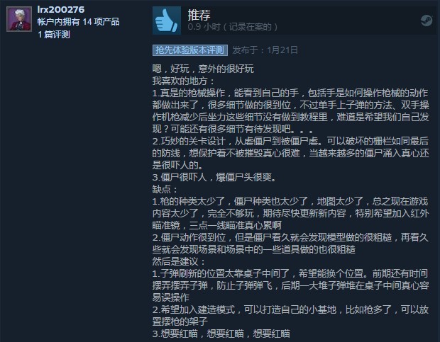根據(jù)Steam平臺(tái)的搶先體驗(yàn)版描述和官方對(duì)用戶的回復(fù)來看,《ZombieFight VR》開發(fā)商稱后期將繼續(xù)更新不同的武器、武器配件、地圖和玩法等等。大多用戶也指出,游戲非常贊,但是武器裝備太少了,期望可以盡早更新!就讓廣大玩家拭目以待吧。