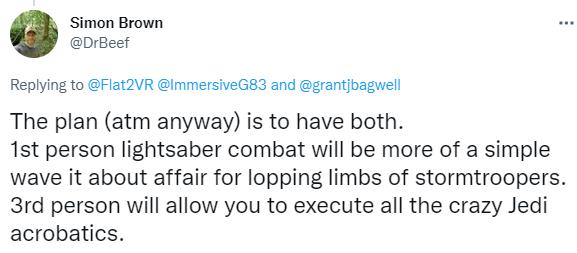 DrBeef推文表示,除了槍戰(zhàn),團(tuán)隊(duì)還在為光劍戰(zhàn)斗提供運(yùn)動(dòng)控制支持,團(tuán)隊(duì)成員Grant Bagwell稱,該團(tuán)隊(duì)還在為「星球大戰(zhàn)絕地武士2:絕地放逐者」開發(fā) VR MOD,這是另一款以絕地學(xué)院為背景的第一人稱/第三人稱動(dòng)作游戲。