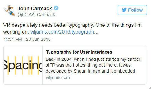 John Carmack 在推特引用了一篇 Viljami Salminen 關(guān)于字體排版的博文并附文表示,“ VR 迫切需要一個(gè)更好的文字排版。這也是我正在做的事情之一。”Viljami Salminen 的博文詳細(xì)講述了作者自己在文字排版上的一些經(jīng)驗(yàn)和技巧,旨在幫助讀者針對不同的應(yīng)用環(huán)境而設(shè)計(jì)更好的用戶界面。
