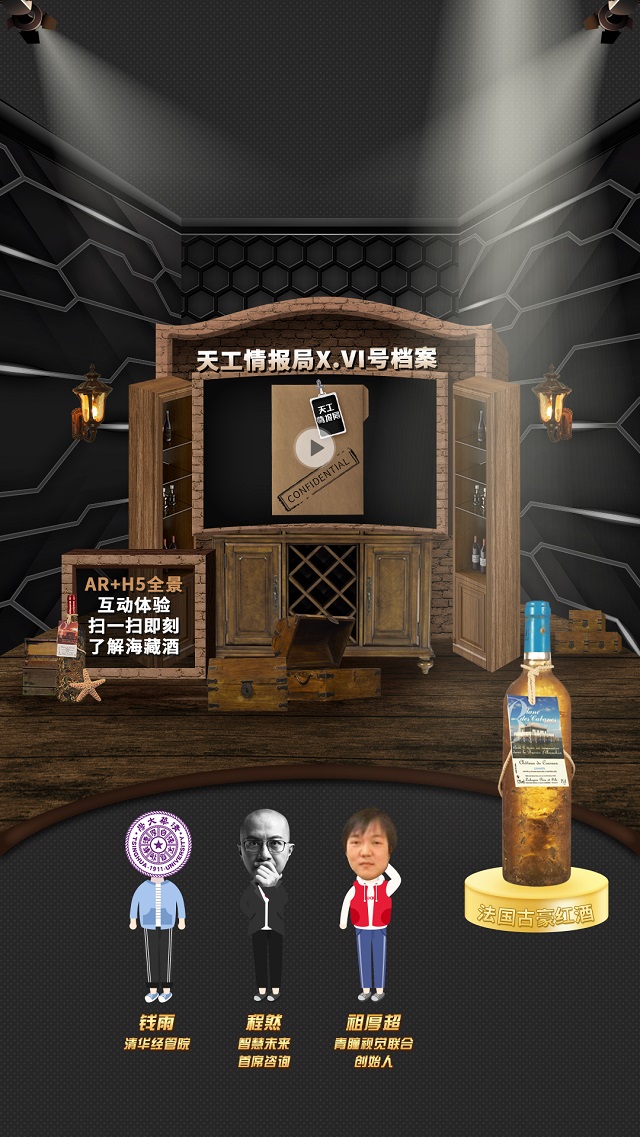 從”守密者“可以看出這應(yīng)該是紅酒案例無(wú)疑了,酒窖式風(fēng)格展館中有幾個(gè)海藏箱有些奇怪,打開檔案袋,通過(guò)AR+全景進(jìn)入了海底世界,被海底世界景色所迷住,點(diǎn)擊交互發(fā)現(xiàn)原來(lái)是知識(shí)類線索交互!AR找尋游戲線索的同時(shí)又了解關(guān)于海藏酒的背景知識(shí),多文字講解類在營(yíng)銷中有些冷門,在這么美的海景中讓知識(shí)變的更有趣味性,一掃“酒”知道!