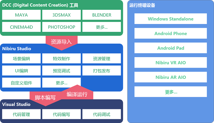 我們有兩個(gè)非常重要的開(kāi)發(fā)工具,一個(gè)是Nibiru Studio,它是我們完全自主開(kāi)發(fā)的三維交互數(shù)字引擎,優(yōu)點(diǎn)在于效率高,有圖形化的開(kāi)發(fā)界面,而且是自主可控的。