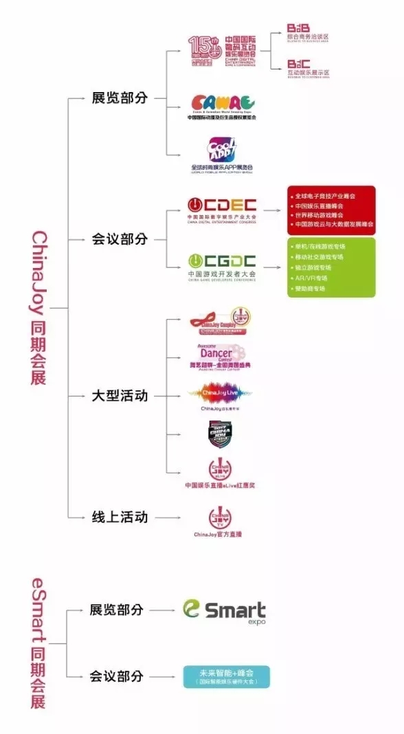 目前,ChinaJoy已形成了以中國國際數(shù)碼互動娛樂展覽會為核心,同期舉辦國際智能娛樂硬件展覽會(eSmart)、中國國際動漫及衍生品授權(quán)展覽會(CAWAE),以及新增的全球時尚娛樂APP展覽會(Cool Apps)在內(nèi)的“泛娛樂”系列展會品牌矩陣,內(nèi)容涵蓋了PC網(wǎng)絡(luò)游戲、移動游戲、主機游戲、電子競技、動漫、影視、音樂、網(wǎng)絡(luò)文學(xué)等多種泛娛樂業(yè)態(tài),受眾定位玩家、消費者、商務(wù)人士及技術(shù)開發(fā)人員等群體,形成了全球規(guī)模最大的數(shù)字化泛娛樂跨界融合、泛娛樂全生態(tài)產(chǎn)業(yè)交流和展示的服務(wù)平臺。