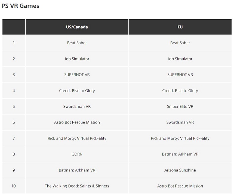 1月17日,索尼公開了2022年度PlayStation商店的游戲下載榜,其中PSVR游戲的下載量TOP 10如下圖(注:左右兩欄分別為北美/加拿大和歐洲地區(qū))。
