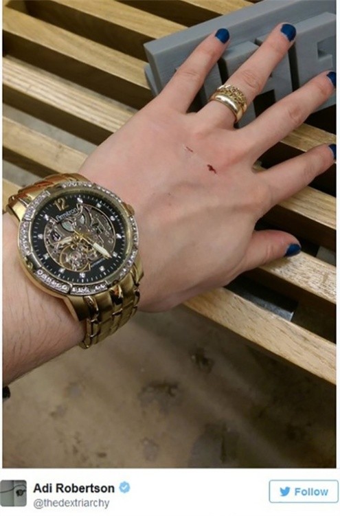 不過從游戲中來看,好像沒有開放對戰(zhàn)模式,自己打出的球還會自動飛回,娛樂輕松的成份比較大??扇绻阏J(rèn)為它只是一款沒有激情的休閑小游戲,那就大錯特錯了。游戲參照現(xiàn)實網(wǎng)球的擊打動作和球速,不會網(wǎng)球技術(shù)要領(lǐng)的玩家還是不容易玩的。主要是怕受傷,因為揮打動作過快,就會造成球速過快,網(wǎng)球受到重?fù)艉蠓磸椓σ埠艽?。最重要的一點是,請記得你是在家里玩網(wǎng)球,在有限的空間里如果激動手部揮打動作太大的話,手是會受傷的哦。請看下圖由國外玩家發(fā)的手部受傷圖(我很好奇這位玩家是男是女呢?汗毛這么多,可又涂著指甲油)