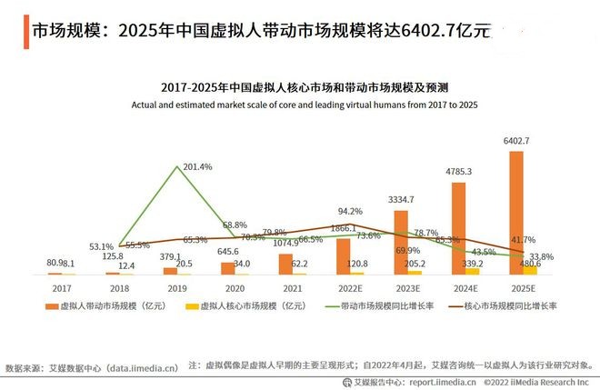 iiMedia Research(艾媒咨詢)數(shù)據(jù)顯示,虛擬人產(chǎn)業(yè)保持穩(wěn)定增長(zhǎng)態(tài)勢(shì),2021年,中國(guó)虛擬人帶動(dòng)產(chǎn)業(yè)市場(chǎng)規(guī)模和核心市場(chǎng)規(guī)模分別為1074.9億元和62.2億元,預(yù)計(jì)2025年分別達(dá)到6402.7億元和480.6億元。