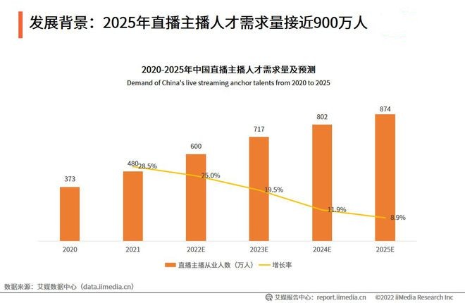 數(shù)據(jù)顯示,中國(guó)直播主播的人才的需求量不斷增長(zhǎng),2021年中國(guó)直播主播人才需求量為480.0萬(wàn)人,預(yù)計(jì)2022年達(dá)600.0萬(wàn)人。艾媒咨詢分析師認(rèn)為,直播行業(yè)的紅利仍存在,且直播行業(yè)生態(tài)圈逐步完善,將吸引更多人才進(jìn)入直播行業(yè)。