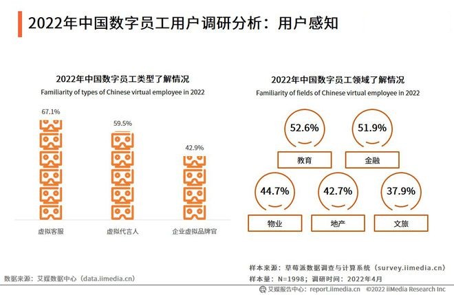 iiMedia Research(艾媒咨詢)調(diào)研數(shù)據(jù)顯示,有67.1%的受訪用戶接觸過(guò)虛擬客服,受訪用戶更了解教育和金融領(lǐng)域的數(shù)字員工,分別占比52.6%和51.9%。艾媒咨詢分析師認(rèn)為,隨著老齡化趨勢(shì)愈加明顯,勞動(dòng)力成本增加,許多領(lǐng)域的企業(yè)紛紛開(kāi)始推出數(shù)字員工。