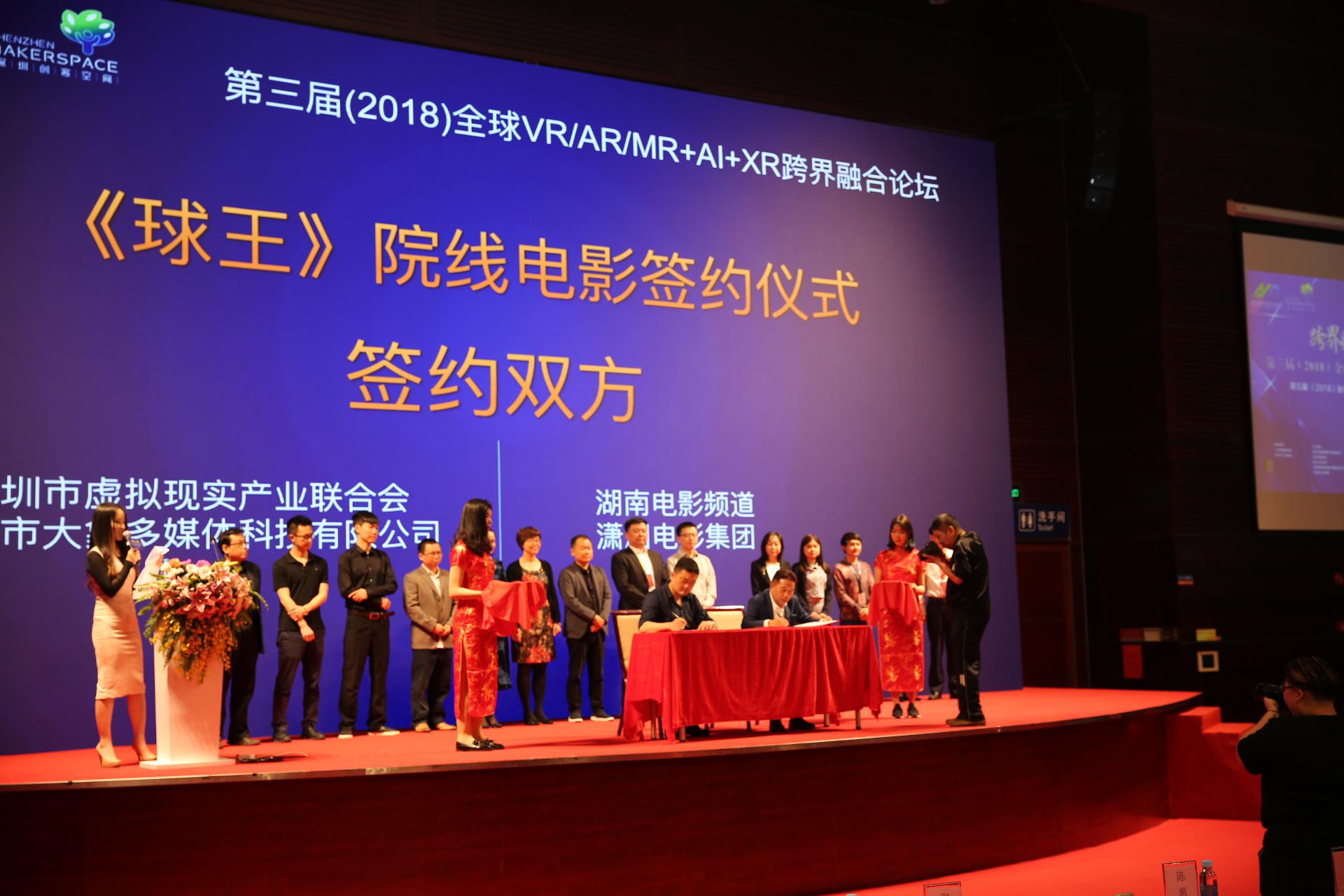 無獨(dú)為偶,在第三屆(2018)全球VR/AR/MR+AI+XR跨界融合論壇上,深圳市大象多媒體科技有限公司也與湖南衛(wèi)視電影頻道現(xiàn)場(chǎng)簽約,雙方將合作共同創(chuàng)作攝制VR大片《球王》。