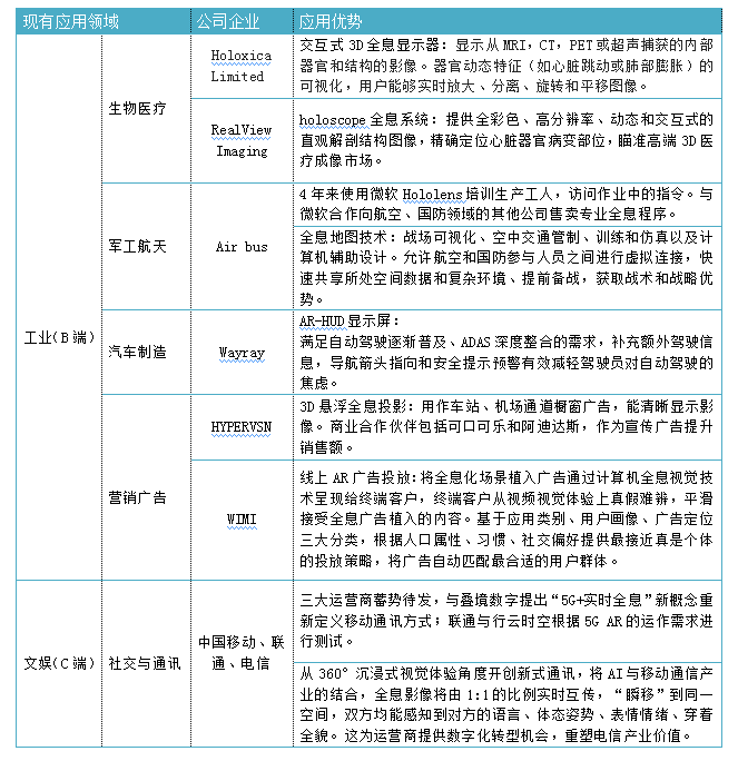 全息AR目前的應(yīng)用空間以to B的工業(yè)領(lǐng)域?yàn)橹?,還涵蓋小部分的to C文娛領(lǐng)域,在B、C端均處于由小眾化市場(chǎng)向大眾化市場(chǎng)滲透的階段。面向群體為對(duì)價(jià)格不敏感的企業(yè)端用戶,對(duì)標(biāo)技術(shù)依賴程度高、資金充裕的行業(yè)。例如生物醫(yī)療、軍用國(guó)防、汽車制造,營(yíng)銷廣告等。其次,C端則嘗試以通訊技術(shù)這一社交剛需作為突破口,促成市場(chǎng)高普及率。