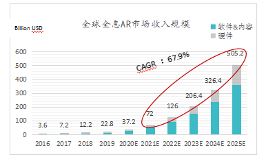 整個(gè)全息顯示市場(chǎng)可按照產(chǎn)品類型、應(yīng)用場(chǎng)景、地域進(jìn)行細(xì)分,賽道廣闊,呈現(xiàn)高速發(fā)展趨勢(shì)。據(jù)映維網(wǎng)預(yù)測(cè),全球全息顯示器賽道市場(chǎng)到2020年將達(dá)到360億美元。而據(jù)frost& sullivan 報(bào)告顯示,全球全息AR賽道市場(chǎng)規(guī)模按收入指標(biāo)計(jì)算,將從2016年的36億美元增長(zhǎng)至2018年122億美元,并推測(cè)會(huì)在2025年創(chuàng)下總收入5052億美元,且在未來(lái)5年的復(fù)合年均增長(zhǎng)率軟硬件均約高達(dá)68%,可見(jiàn)其未來(lái)市場(chǎng)空間不可限量。國(guó)際巨頭在全息AR行業(yè)的市場(chǎng)布局主要關(guān)注AR顯示設(shè)備,底層SDK平臺(tái)和AI技術(shù),例如蘋果公司的AR kit以及谷歌公司的AR Core都是為AR專研的軟件工具開(kāi)發(fā)包平臺(tái),國(guó)內(nèi)市場(chǎng)則更關(guān)注其軟件應(yīng)用程序的開(kāi)發(fā)。
