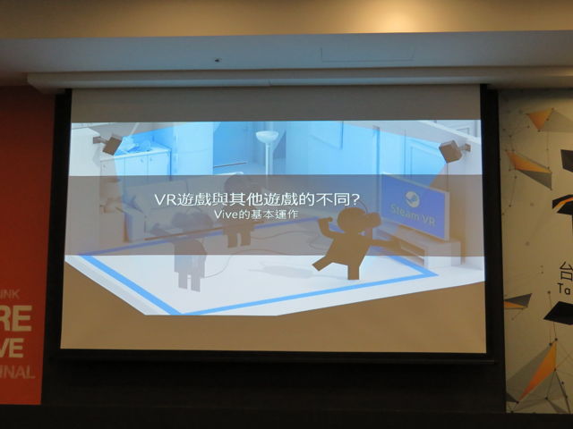 他強調(diào),在制作游戲之前首先要了解硬件的潛力和優(yōu)勢,以往游戲都是透過屏幕呈現(xiàn),控制器、鼠標或鍵盤等方式游玩,然而VR游戲最大的不同點就是屏幕非常貼近眼睛,讓玩家的畫面能十分的有立體感,操作方式雖然也有游戲桿,但與除了有按鈕的方式外,還有其他的操作可能性。除了優(yōu)勢,硬件可能遇到的限制也是需要了解的,例如Vive的空間最好的呈現(xiàn)效果是3*5公尺,這對于游戲制作上來說可能就是一個限制。