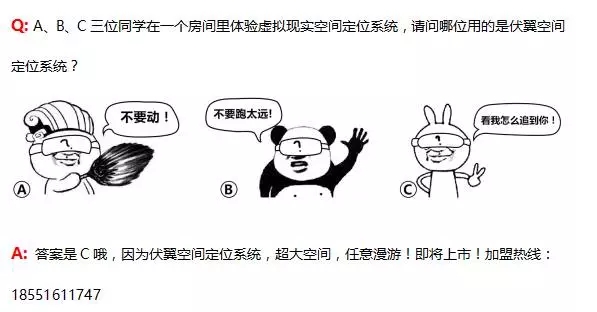 具體來說,這套空間定位系統(tǒng)是一個多人合作,自由漫游式的移動化的虛擬現(xiàn)實系統(tǒng),它能夠跟蹤玩家的位置,然后將其轉換成數(shù)字運動。什么是自由漫游?要我說人話?來道2016年VR的高考的選擇題,也許你看到答案就會漲姿勢啦。