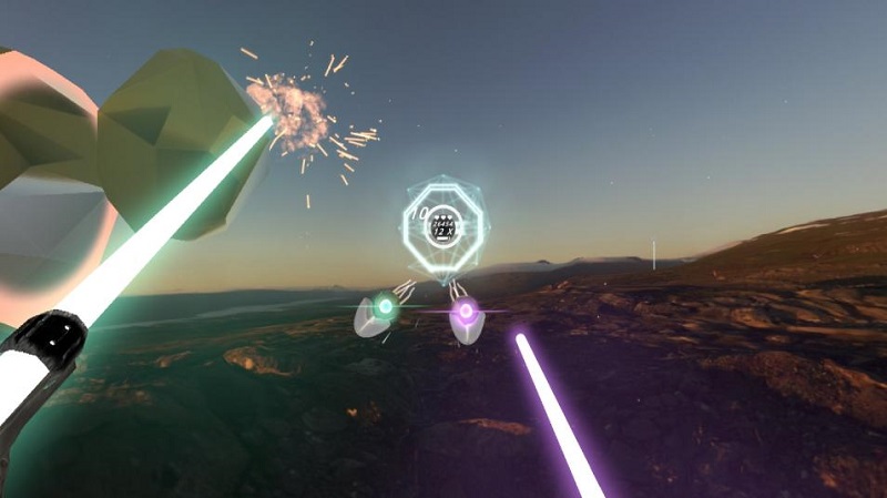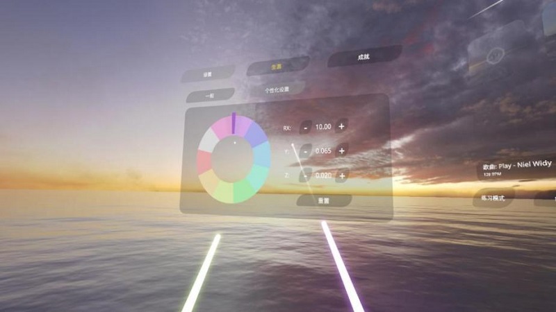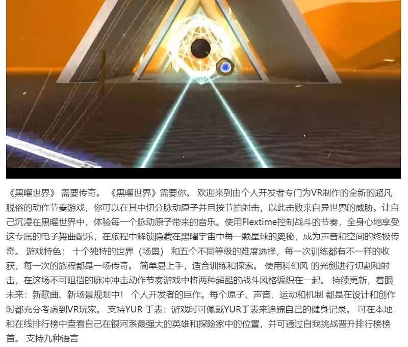 據(jù)Niel Widy分享,「黑曜世界」是一款以黑曜作為主題的沉浸式VR節(jié)奏音游,玩家可以利用手中的光劍配合音樂節(jié)拍來劈砍迎面而來的脈動原子,與「Beat Saber」有所不同的是,玩家手中的光劍也可轉(zhuǎn)換為爆能槍,玩家可以根據(jù)情況自由切換射擊模式或擊砍模式,擊落前方不同顏色的節(jié)奏球體和人形敵人。而且,在游戲過程中,玩家可調(diào)節(jié)游戲速度,適當(dāng)放緩游戲節(jié)奏來制定下一步的策略。同時,游戲中還會顯示并記錄玩家所消耗的卡路里等健身數(shù)據(jù),并根據(jù)玩家揮砍和射擊的精準(zhǔn)度以及攻擊的強(qiáng)度來計(jì)算玩家得分,讓玩家在充滿趣味的游戲中鍛煉身體,可謂樂在其中。