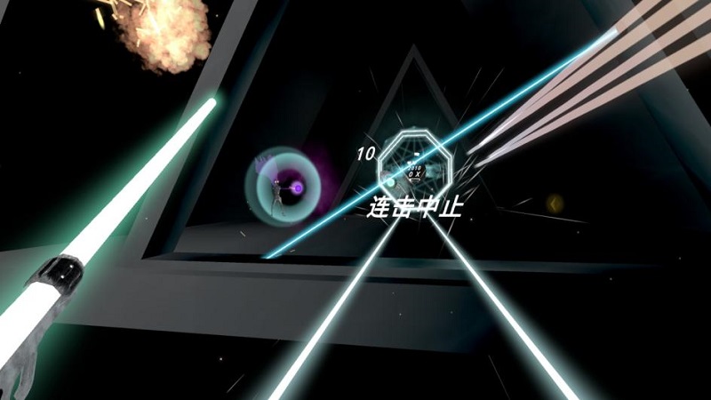 進(jìn)入《黑曜世界》,玩家可以利用手中的光劍配合節(jié)奏來劈砍迎面而來的脈動原子,也能以劍為槍,利用光劍射出的子彈擊殺來自異世界的威脅,主動出擊的同時,還要注意躲避戰(zhàn)時激光障礙和敵人發(fā)出的子彈??梢缘脑挘婕乙M可能多地?fù)糁幸舴途垣@得更高的能量值和子彈數(shù),當(dāng)對光劍的控制熟練到身體本能反應(yīng)的程度時,玩家就離“黑曜大神”不遠(yuǎn)咯!