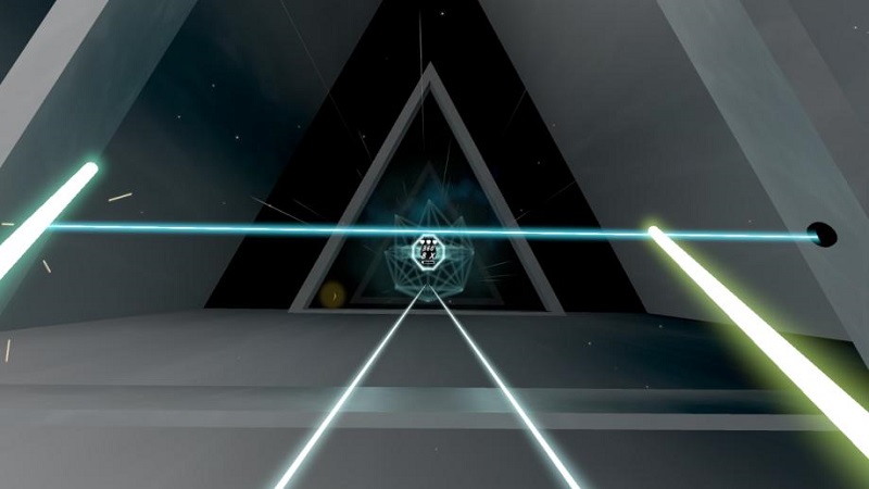 談到VR節(jié)奏音游,玩家們最熟悉的自然莫過于堪稱VR節(jié)奏音游天花板的「Beat Saber」。作為同類型游戲,「黑曜世界」在基礎(chǔ)玩法上與「Beat Saber」類似,玩家需要手持兩把不同顏色的光劍揮砍與之顏色對應(yīng)的節(jié)奏音符方塊,并根據(jù)揮砍的準(zhǔn)度與力度來獲取相應(yīng)分?jǐn)?shù)。而「黑曜世界」之所以依舊能夠在節(jié)奏音游的賽道中嶄露頭角,則與其在玩法和游戲元素上的多元創(chuàng)新設(shè)計(jì)有很大關(guān)系。