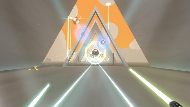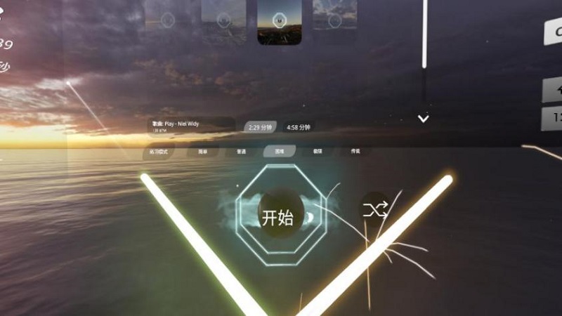 游戲中的節(jié)奏方塊、隕石、激光切割線等元素都對應(yīng)著音樂節(jié)拍,且游戲中又同時融合了揮砍、射擊、躲避等多種操作,因此玩家在游戲中的動作能夠相應(yīng)地化為一種有韻律的舞蹈動作,以這樣的方式將游戲與健身有機(jī)結(jié)合,為玩家?guī)砀鼮樾缕娴墓?jié)奏音游體驗(yàn)。