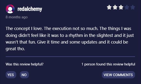 SideQuest玩家評論:游戲概念是我喜歡的,但是游戲的打擊感和節(jié)奏感并不強(qiáng),而且玩起來趣味性也不夠,期待后續(xù)更新優(yōu)化能夠讓這款游戲的體驗(yàn)越來越棒。